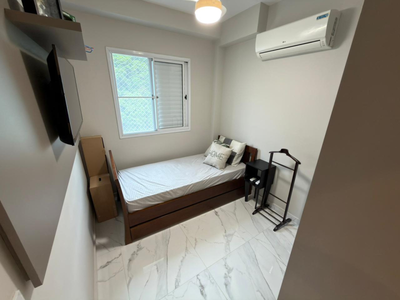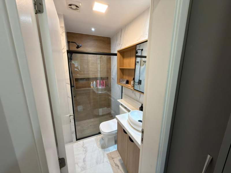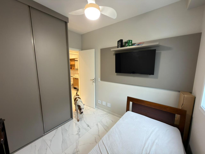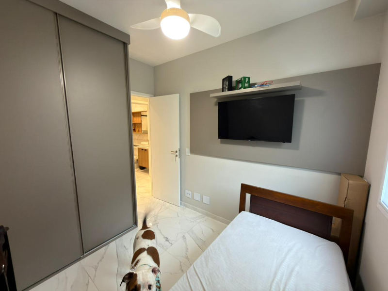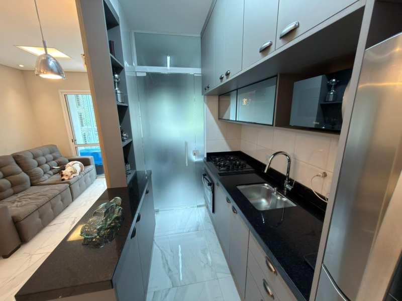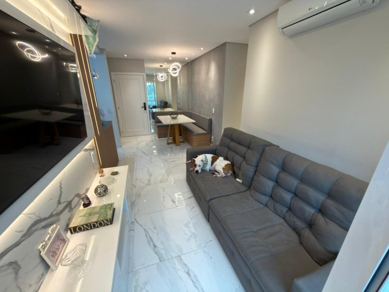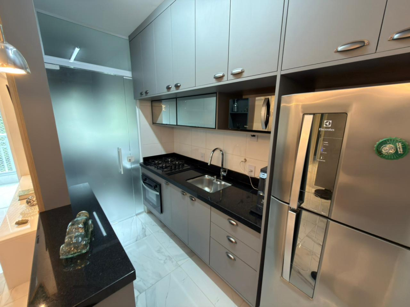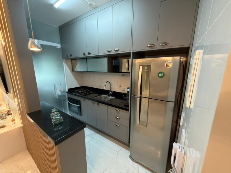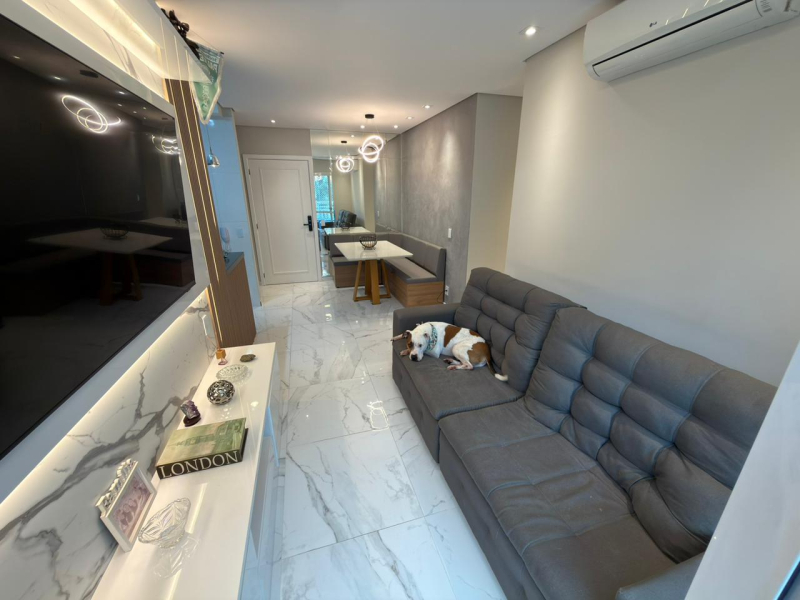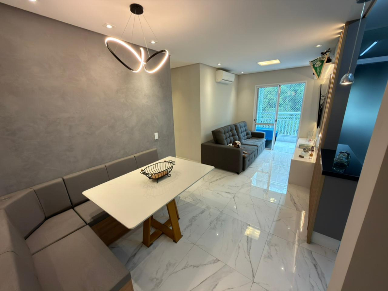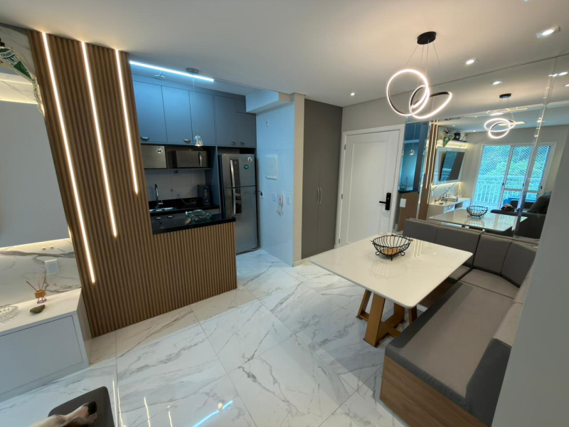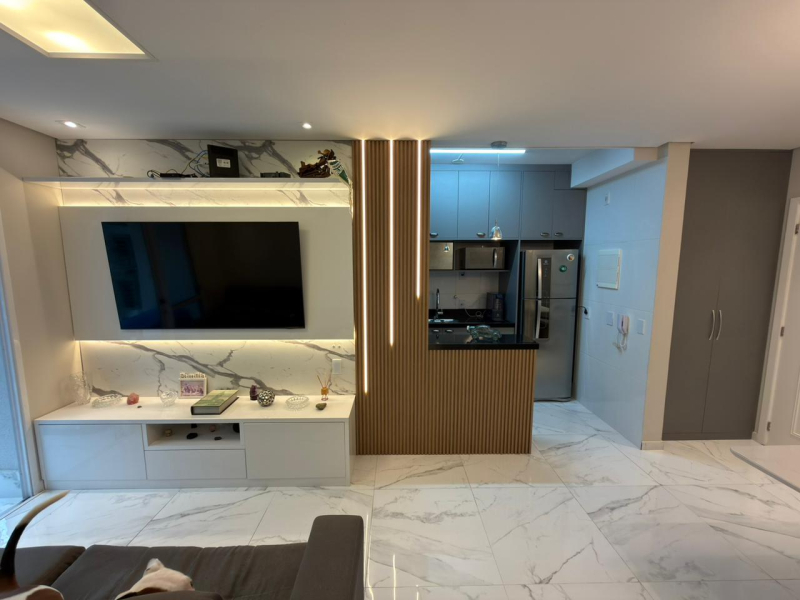 Este apartamento possui 2 dormitórios, sendo 1 suíte, sala para 2 ambientes, cozinha e área de serviço conjugadas, além de 2 banheiros e 1 vaga de garagem.